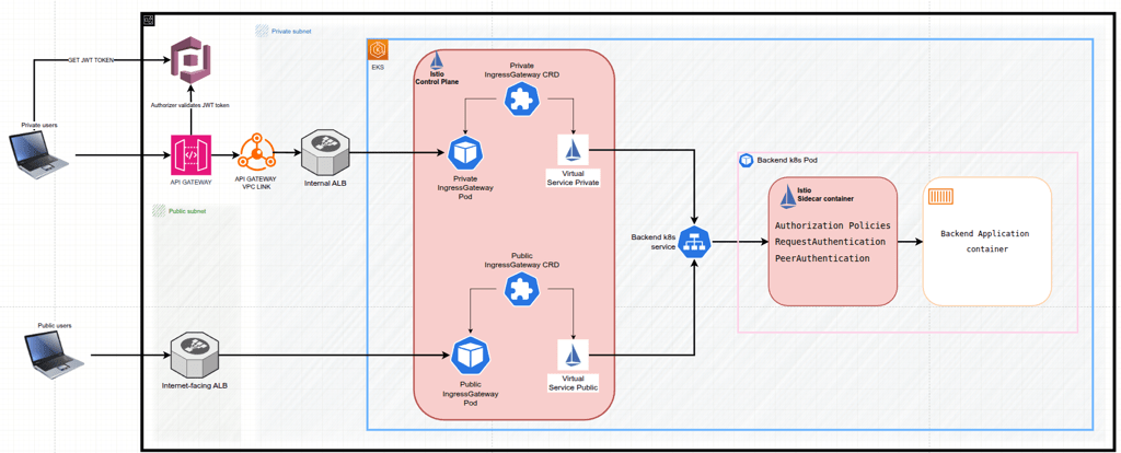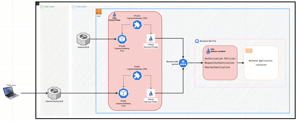 - Internal ALB → load balances to private private Istio Ingress Gateway (AWS EKS)