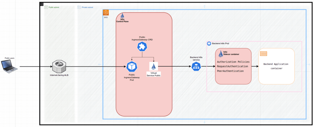Imagine an internal microservice‑oriented application running entirely inside a private Amazon VPC. The workloads are deployed on AWS EKS cluster. An Internet‑facing Application Load Balancer (ALB) anchored in the public subnets listens public clients’ requests on port 443, terminates TLS and forwards traffic to a target group that, in its turn, points at the public Istio Ingress Gateway (i.e. pods) running inside the cluster. Once inside the mesh, Istio Service Mesh enforces mutual TLS between microservices, applies fine‑grained authorization based on JWT claims. Additionally, the public Istio Virtual Service helps us to direct requests coming from the public Istio Ingress Gateway to the certain Kubernetes Service, backing the target microservice application pods – see Figure 1.