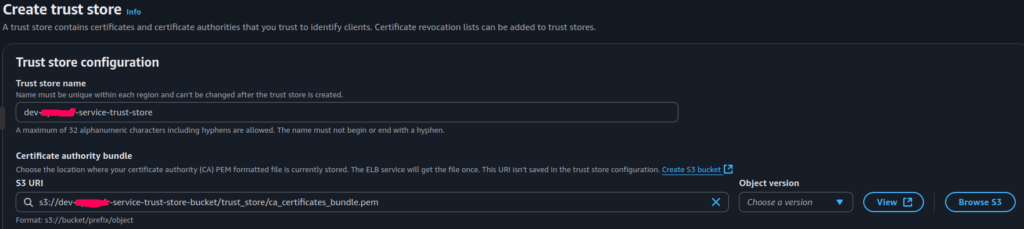 First, we use the AWS Trust Store, which is backed by Amazon S3, to store the CA certificate that signed the IoT device’s certificate. This CA will be used by ALB to verify IoT device certificates.