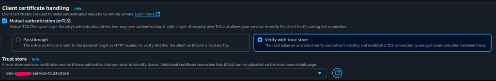 In verify mode, the ALB validates the client certificate itself during the TLS handshake. If the certificate is valid and signed by a trusted CA (that we in advance configure in the ALB trust store), the connection is allowed to proceed.