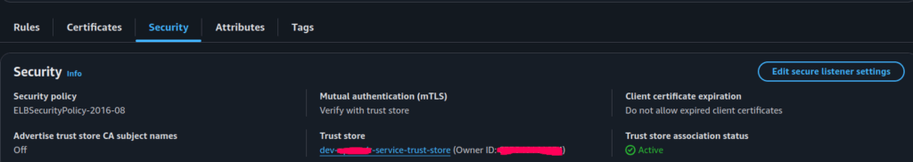 Next, we configure the AWS ALB listener to enable mutual TLS and specify that it should use the Trust Store for IoT device’s authentication.
