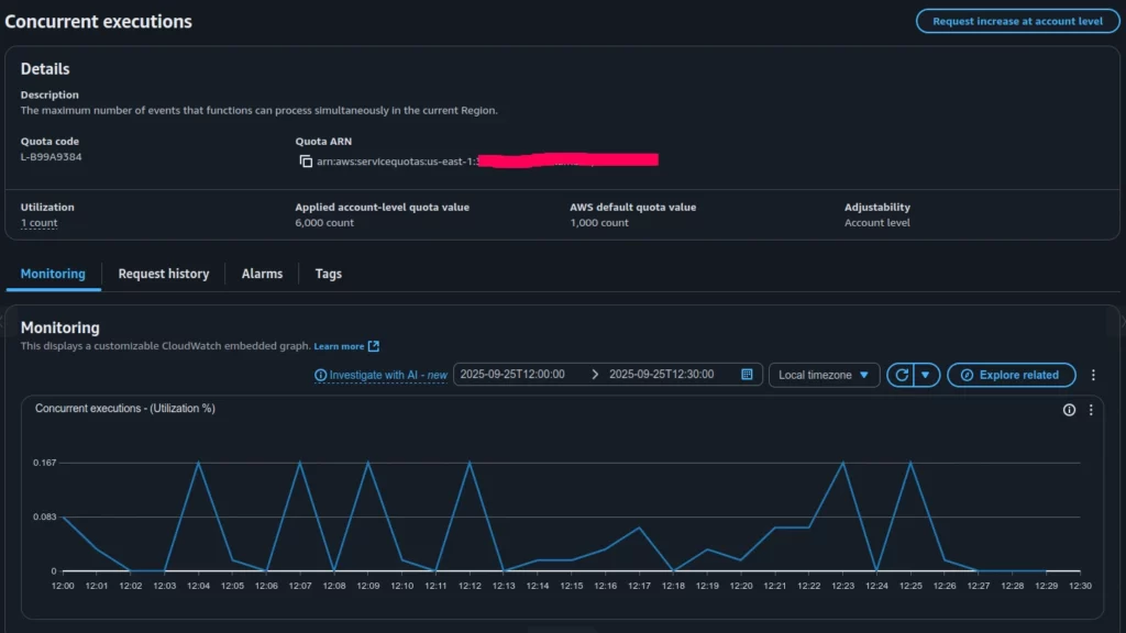 Concurrent executions represent the number of function instances that are running at the same time in a given region. If one function is processing 50 requests in parallel and another is processing 20 at the same time, your account’s total concurrent executions is 70. Concurrency matters because it reflects the actual load being handled by Lambda at a given moment and it is tied directly to AWS quotas.