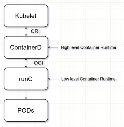 In the diagram, the ContainerD component represents a high-level container runtime. ContainerD is lightweight and designed specifically for Kubernetes. It implements the CRI, receives instructions from the kubelet and manages container images, storage and networking. However, ContainerD itself does not create containers directly. Instead, it delegates that task to a low-level container runtime.